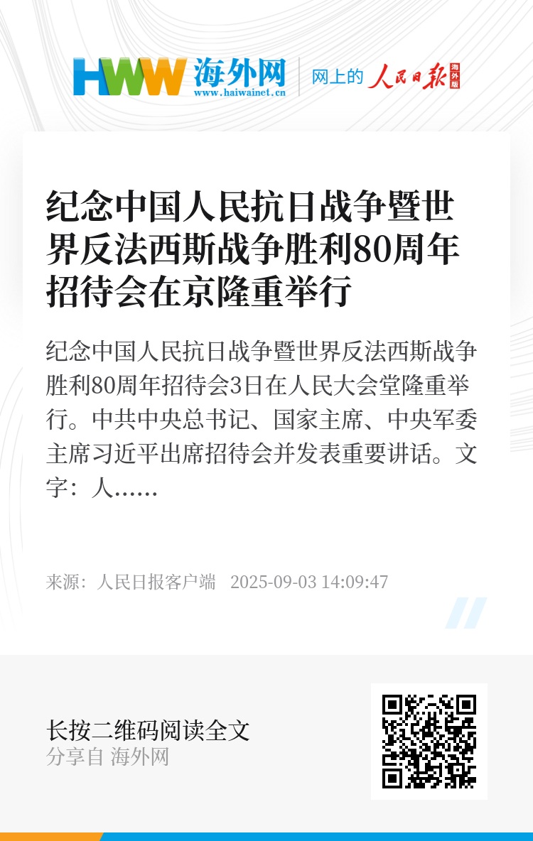 纪念中国人民抗日战争暨世界反法西斯战争胜利80周年招待会3日在人民大会堂隆重举行。中共中央总书记、国家主席、中央军委主席习近平出席招待会并发表重要讲话。