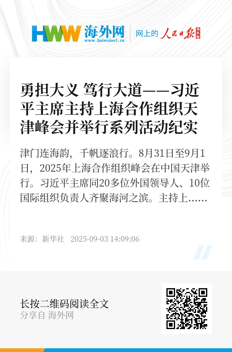 “中方愿同各方一道,勇担大义、笃行大道,弘扬正确二战史观,坚定维护二战胜利成果,让推进全球治理体系变革、推动构建人类命运共同体的成果更多更好造福全人类!”“上海合作组织+”会议上,习近平主席的重要宣示通过现场直播传向世界。