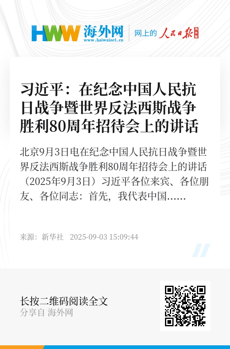 今天上午,我们举行盛大阅兵仪式,隆重纪念中国人民抗日战争暨世界反法西斯战争胜利80周年,目的是铭记历史、缅怀先烈、珍爱和平、开创未来。