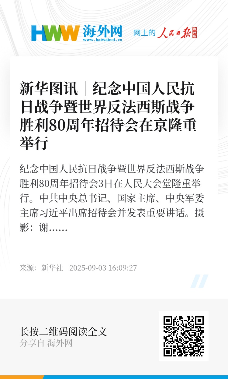 纪念中国人民抗日战争暨世界反法西斯战争胜利80周年招待会3日在人民大会堂隆重举行。中共中央总书记、国家主席、中央军委主席习近平出席招待会并发表重要讲话。