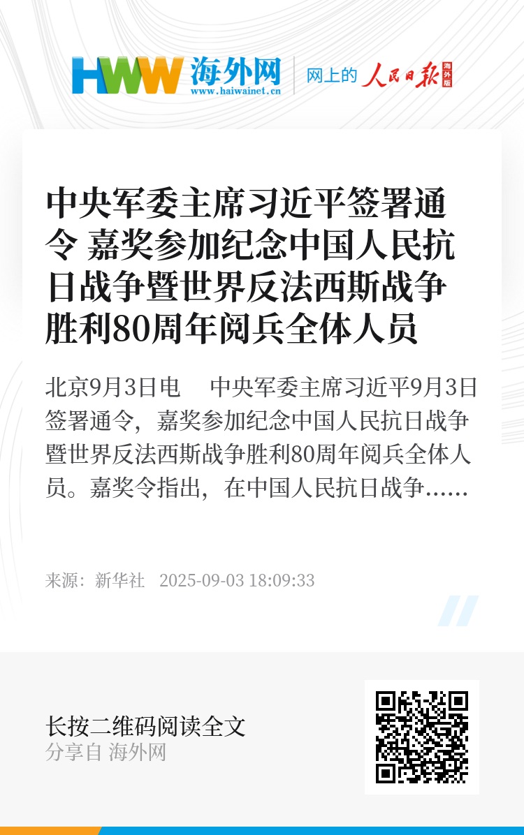 新华社北京9月3日电 中央军委主席习近平9月3日签署通令,嘉奖参加纪念中国人民抗日战争暨世界反法西斯战争胜利80周年阅兵全体人员。
