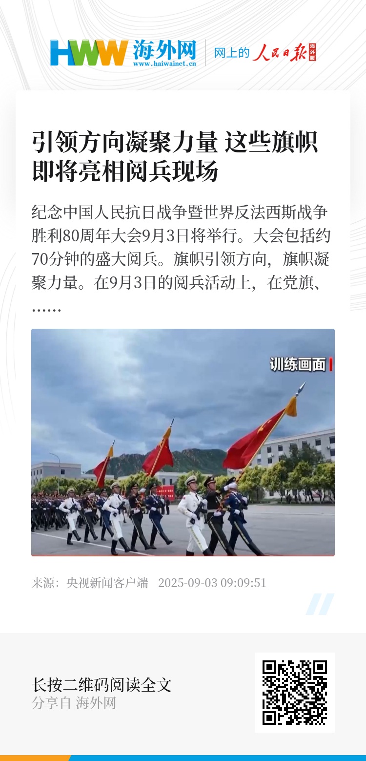 纪念中国人民抗日战争暨世界反法西斯战争胜利80周年大会9月3日将举行。大会包括约70分钟的盛大阅兵。旗帜引领方向,旗帜凝聚力量。在9月3日的阅兵活动上,在党旗、国旗、军旗引领下,受阅方队将擎军旗和武警部队旗集中亮相,战旗方队也将展示功勋荣誉旗帜。