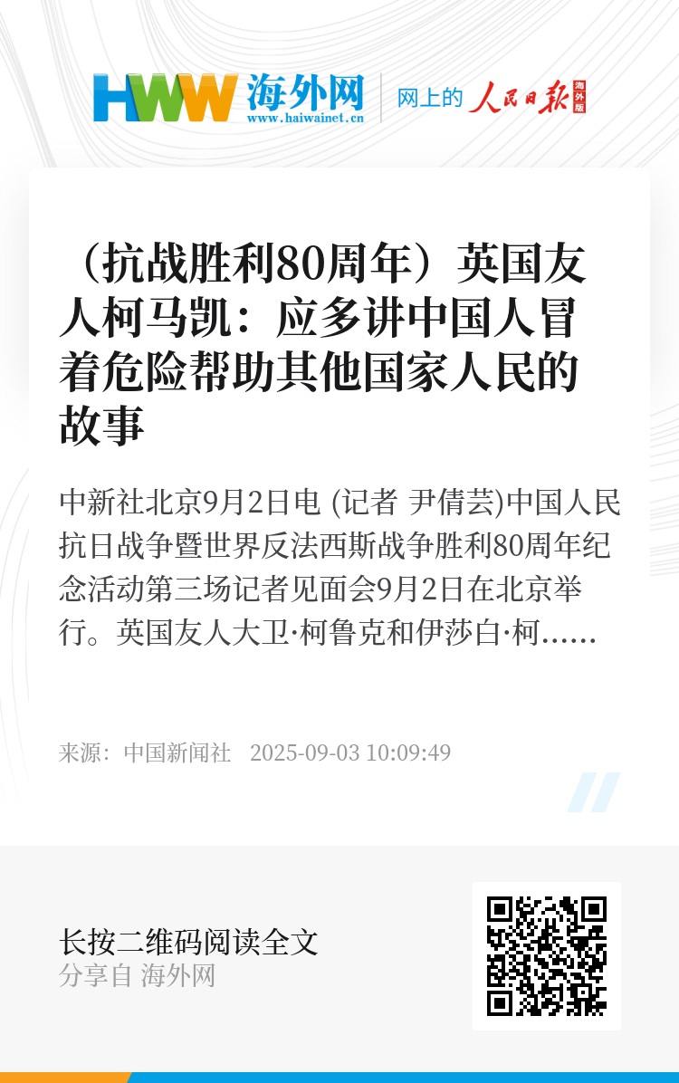 中新社北京9月2日电 (记者 尹倩芸)中国人民抗日战争暨世界反法西斯战争胜利80周年纪念活动第三场记者见面会9月2日在北京举行。英国友人大卫·柯鲁克和伊莎白·柯鲁克之子柯马凯在会上说,应该多讲一些中国人冒着危险帮助其他国家人民的故事。