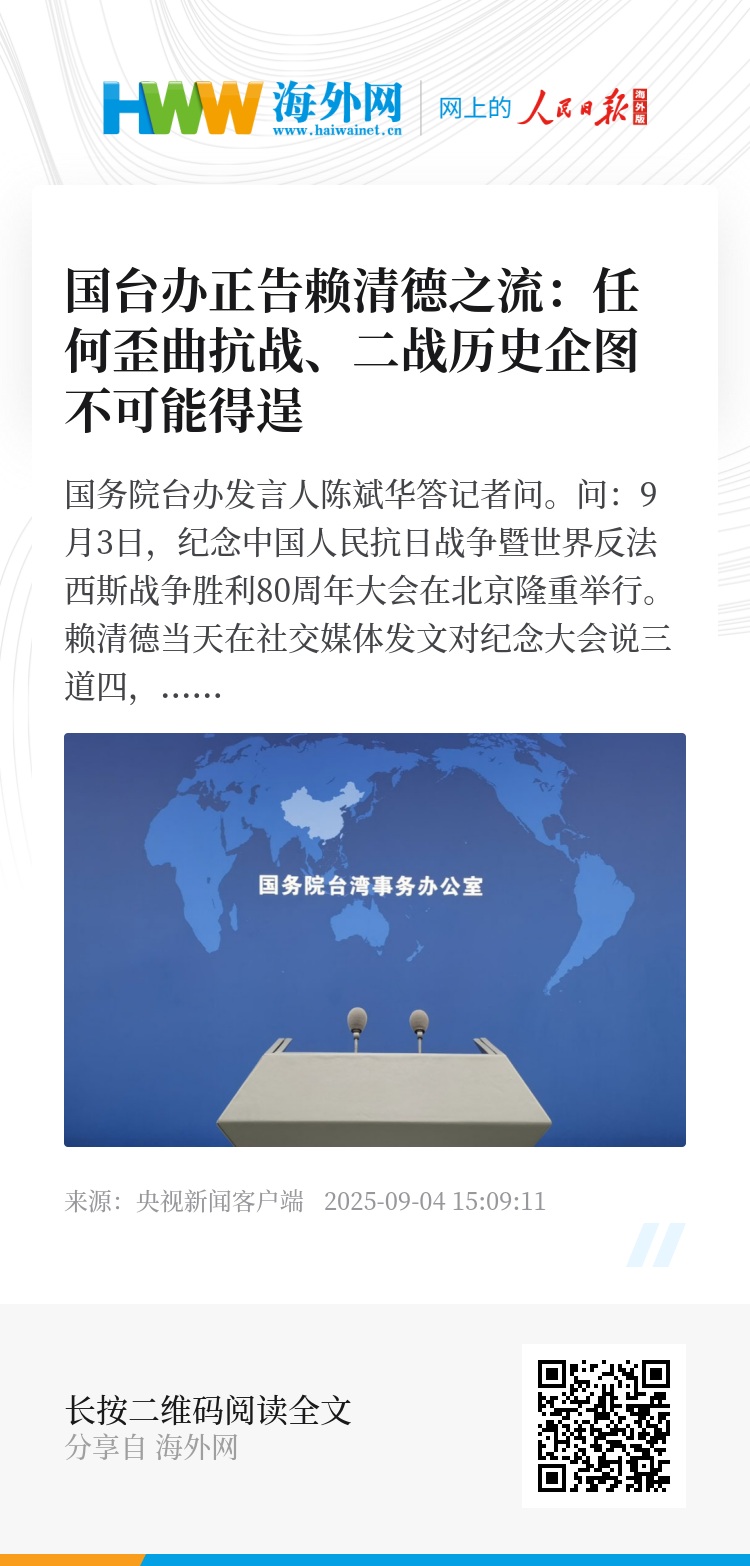 正告赖清德之流,任何歪曲抗战、二战历史的企图都不可能得逞,任何挑战战后国际秩序、人类正义良知的行径都必然失败,任何与全体中国人民为敌、妄图分裂国家的图谋都将自取灭亡。正义必胜,人民必胜,统一必胜!