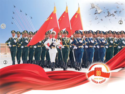 图①:9月3日,纪念中国人民抗日战争暨世界反法西斯战争胜利80周年大会在北京隆重举行。图为教练机梯队接受检阅。