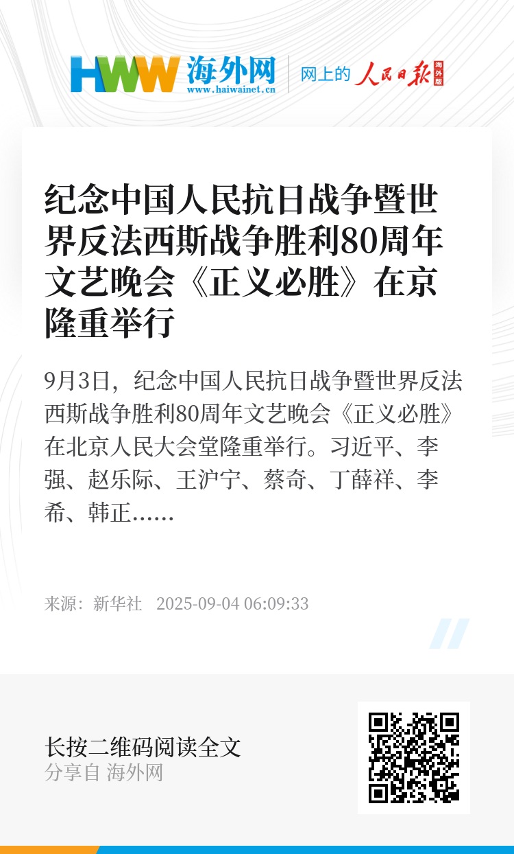 9月3日,纪念中国人民抗日战争暨世界反法西斯战争胜利80周年文艺晚会《正义必胜》在北京人民大会堂隆重举行。习近平、李强、赵乐际、王沪宁、蔡奇、丁薛祥、李希、韩正等党和国家领导人,与约6000名中外人士一起观看晚会。