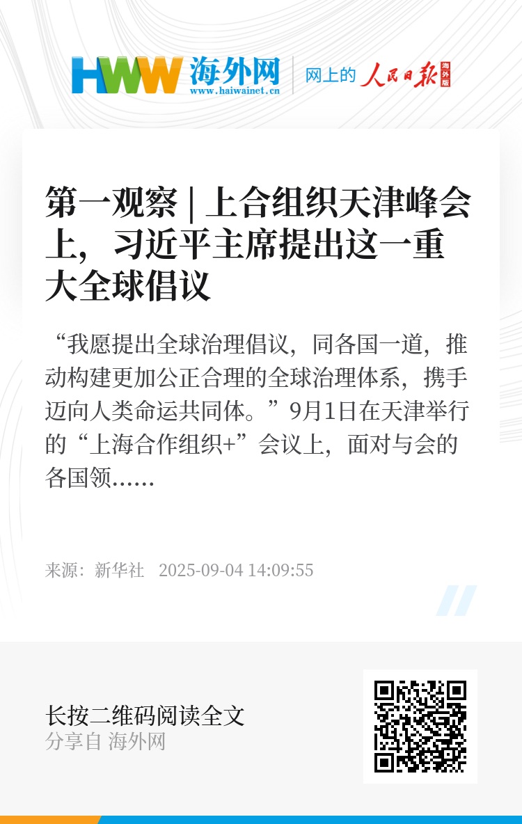 “再过两天,中方将在北京隆重举行纪念中国人民抗日战争暨世界反法西斯战争胜利80周年活动,很多同事都将出席。中方愿同各方一道,勇担大义、笃行大道,弘扬正确二战史观,坚定维护二战胜利成果,让推进全球治理体系变革、推动构建人类命运共同体的成果更多更好造福全人类!”会上,习近平主席的宣示感召人心。