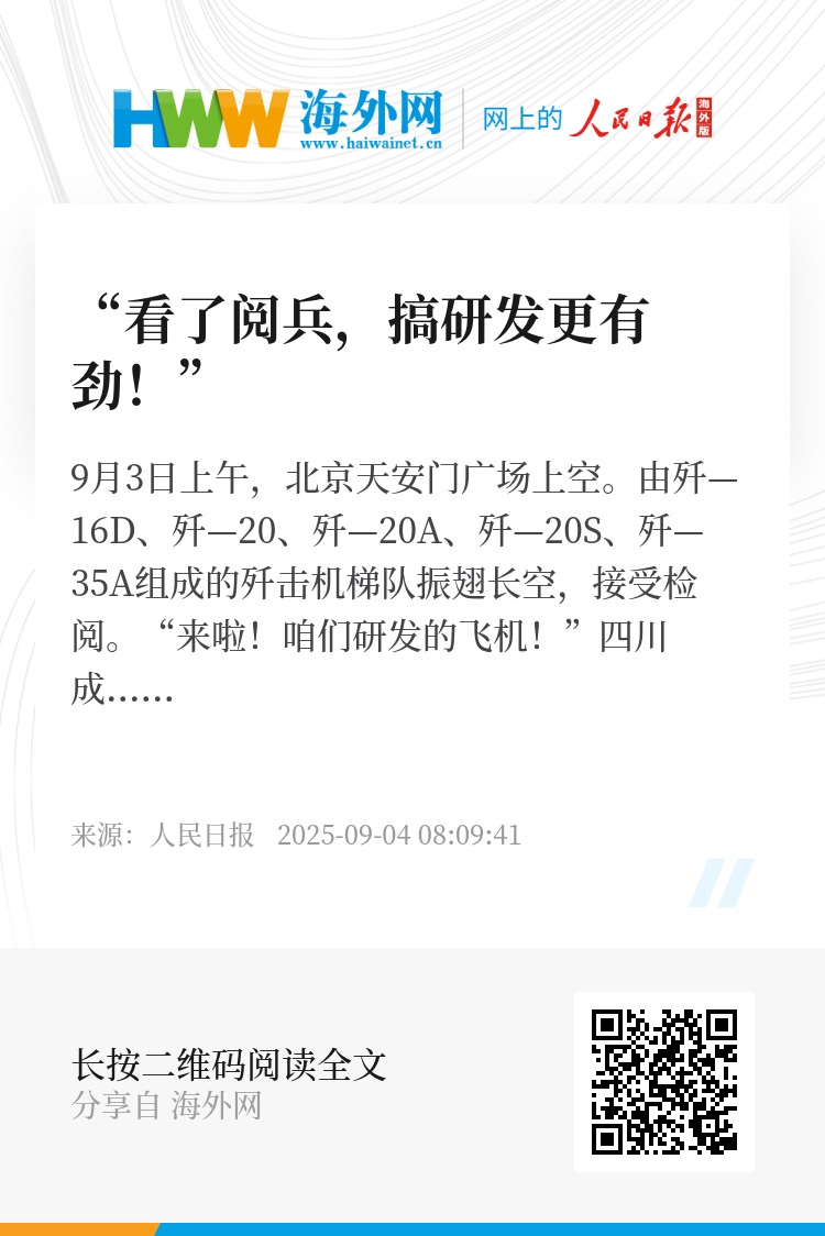 “看了阅兵,搞研发更有劲!”成都所高级工程师铁钰嘉刚看完直播,径直回到实验室,“我们要把目光投向体系化、智能化、无人化等方向,探索更加先进的技术,铸造更多的‘国之重器’!”(记者 宋豪新)