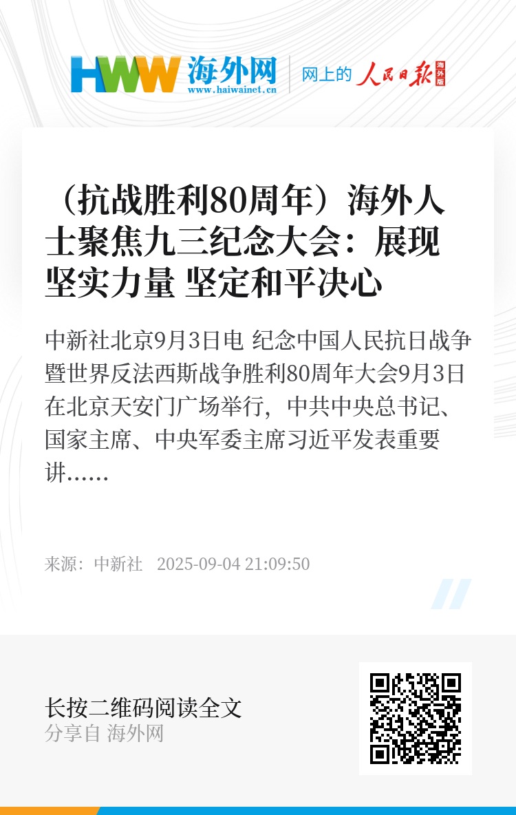 中新社北京9月3日电 纪念中国人民抗日战争暨世界反法西斯战争胜利80周年大会9月3日在北京天安门广场举行,中共中央总书记、国家主席、中央军委主席习近平发表重要讲话并检阅受阅部队。海外各界人士高度关注,认为中国通过九三纪念大会展示了坚实的国防力量,展现了维护世界和平、推进多边主义的坚定决心。