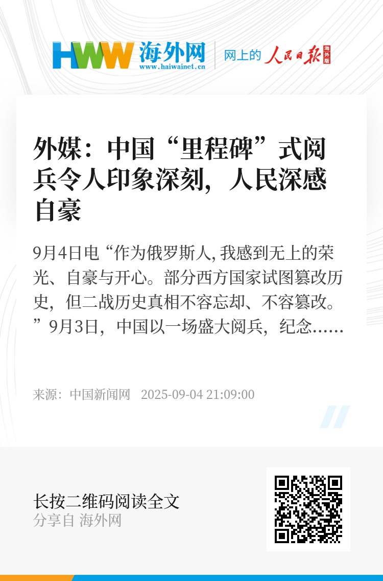 中新网9月4日电 “作为俄罗斯人,我感到无上的荣光、自豪与开心。部分西方国家试图篡改历史,但二战历史真相不容忘却、不容篡改。”9月3日,中国以一场盛大阅兵,纪念中国人民抗日战争暨世界反法西斯战争胜利80周年。“今日俄罗斯”记者阿丽娜出席观看了此次阅兵活动,并对此大为赞叹。