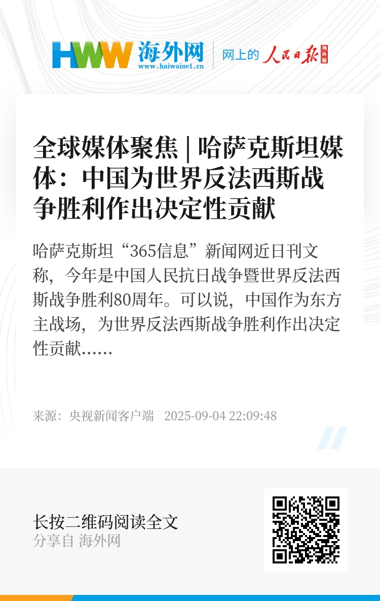 哈萨克斯坦“365信息”新闻网近日刊文称,今年是中国人民抗日战争暨世界反法西斯战争胜利80周年。可以说,中国作为东方主战场,为世界反法西斯战争胜利作出决定性贡献。