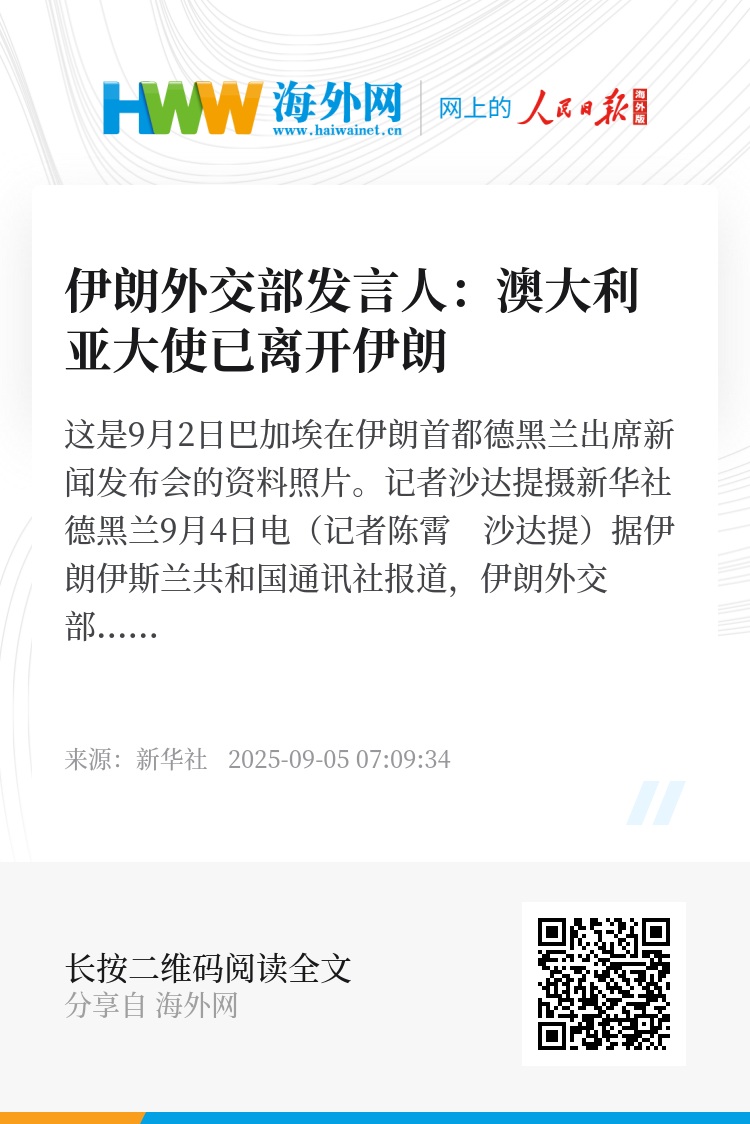 新华社德黑兰9月4日电(记者陈霄 沙达提)据伊朗伊斯兰共和国通讯社报道,伊朗外交部发言人巴加埃4日说,澳大利亚驻伊朗大使已离开伊朗。
