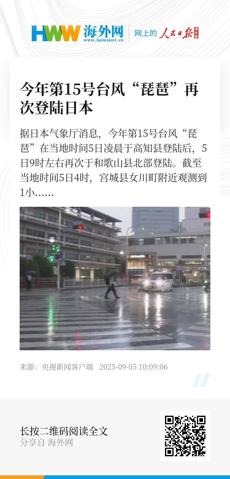据日本气象厅消息,今年第15号台风“琵琶”在当地时间5日凌晨于高知县登陆后,5日9时左右再次于和歌山县北部登陆。