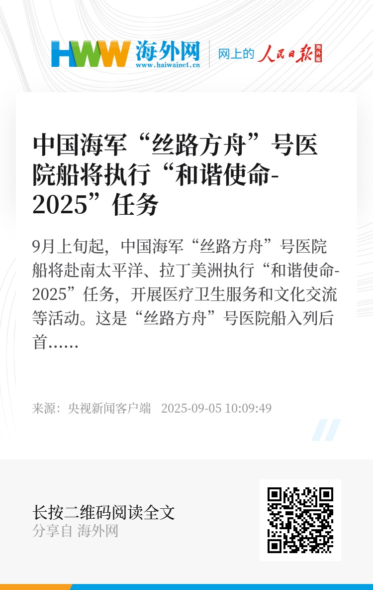 9月上旬起,中国海军“丝路方舟”号医院船将赴南太平洋、拉丁美洲执行“和谐使命-2025”任务,开展医疗卫生服务和文化交流等活动。这是“丝路方舟”号医院船入列后首次赴海外执行任务,旨在增进中国与有关国家友好合作,为国际社会提供更多公共安全产品,更好践行人类命运共同体和海洋命运共同体理念。