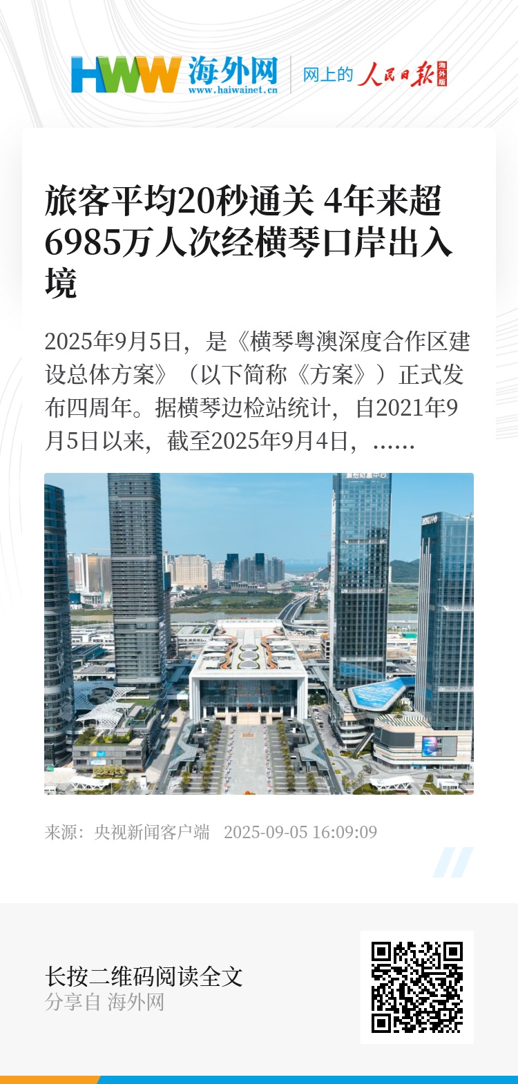 2025年9月5日,是《横琴粤澳深度合作区建设总体方案》(以下简称《方案》)正式发布四周年。据横琴边检站统计,自2021年9月5日以来,截至2025年9月4日,横琴边检共验放出入境人员和车辆分别达6985万人次和812万辆次,其中澳门居民超1675万人次,澳门单牌车超538万辆次,分别占总量的24%和66%。