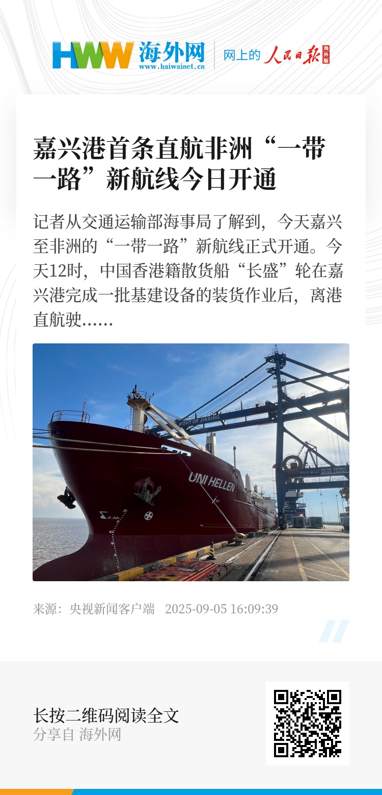 记者从交通运输部海事局了解到,今天嘉兴至非洲的“一带一路”新航线正式开通。今天12时,中国香港籍散货船“长盛”轮在嘉兴港完成一批基建设备的装货作业后,离港直航驶往坦桑尼亚桑给巴尔港和莫桑比克贝拉港。航线的开通实现了嘉兴港中非直航航线“零的突破”。