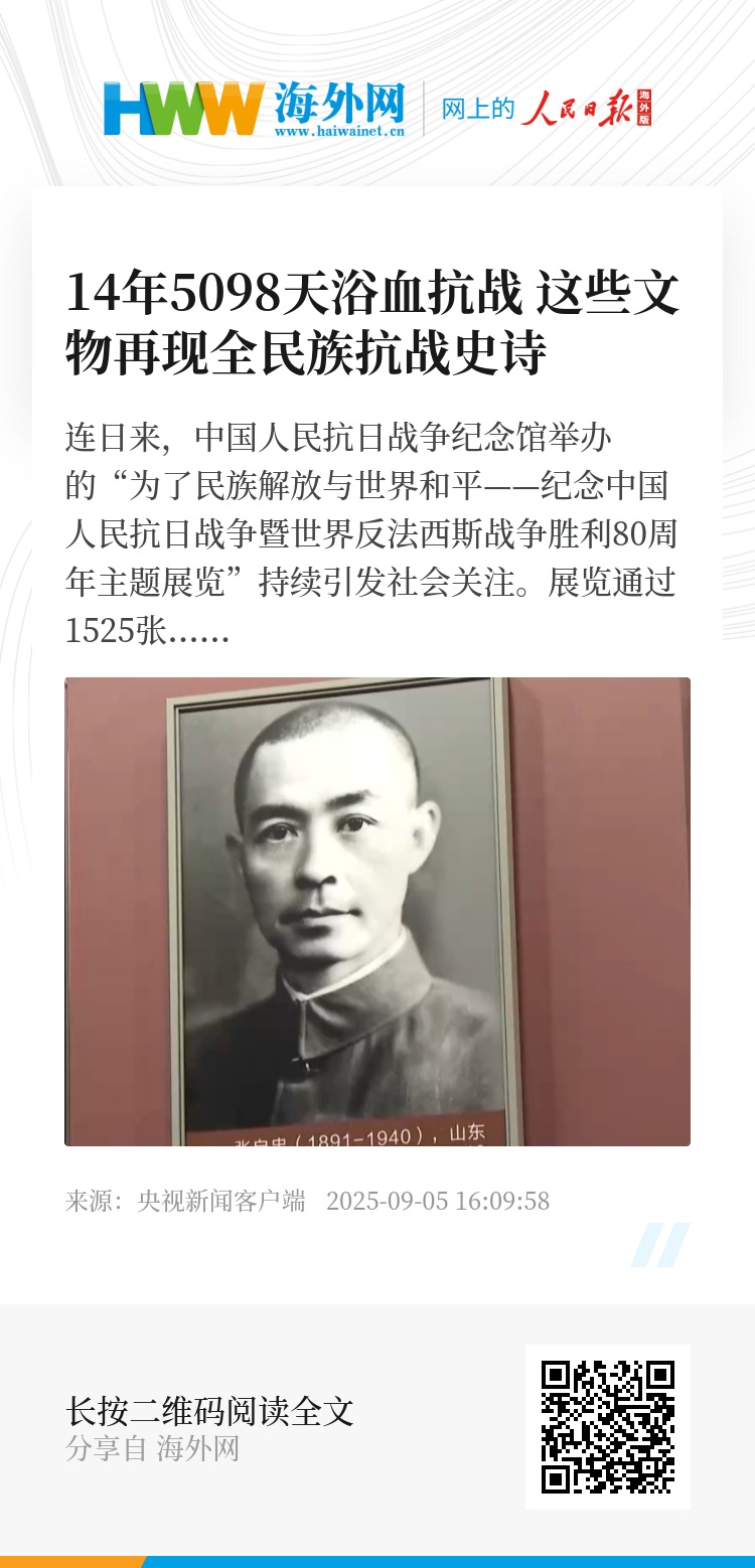 中国人民抗日战争纪念馆宣教专员 周耐:5098是指四亿五千万的中国人民从1931年9月18日,一直到1945年的9月2日,一共5098天,14年浴血抗战历程。照片墙上有军人在战场上骁勇奋战的场景,还有少年儿童,有青年知识分子,以及妇女。那个时候不分阶级党派,不分男女老幼,不分民族宗教,大家同舟共济投入抗日救亡的神圣事业当中。所以我们中国人民抗日战争的胜利是由无数正义的仁人志士共御外侮,才迎来最终的胜利。