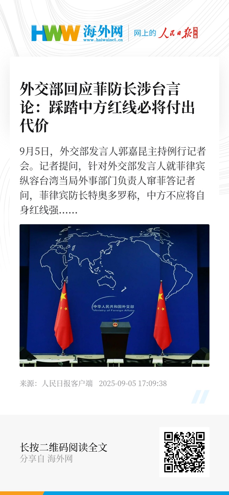 记者提问,针对外交部发言人就菲律宾纵容台湾当局外事部门负责人窜菲答记者问,菲律宾防长特奥多罗称,中方不应将自身红线强加于菲方。台湾“官员”来访系菲主权。林佳龙未会见菲方官员。菲承诺奉行一中政策,但中方不应就此对菲指手画脚。中方对此有何评论?