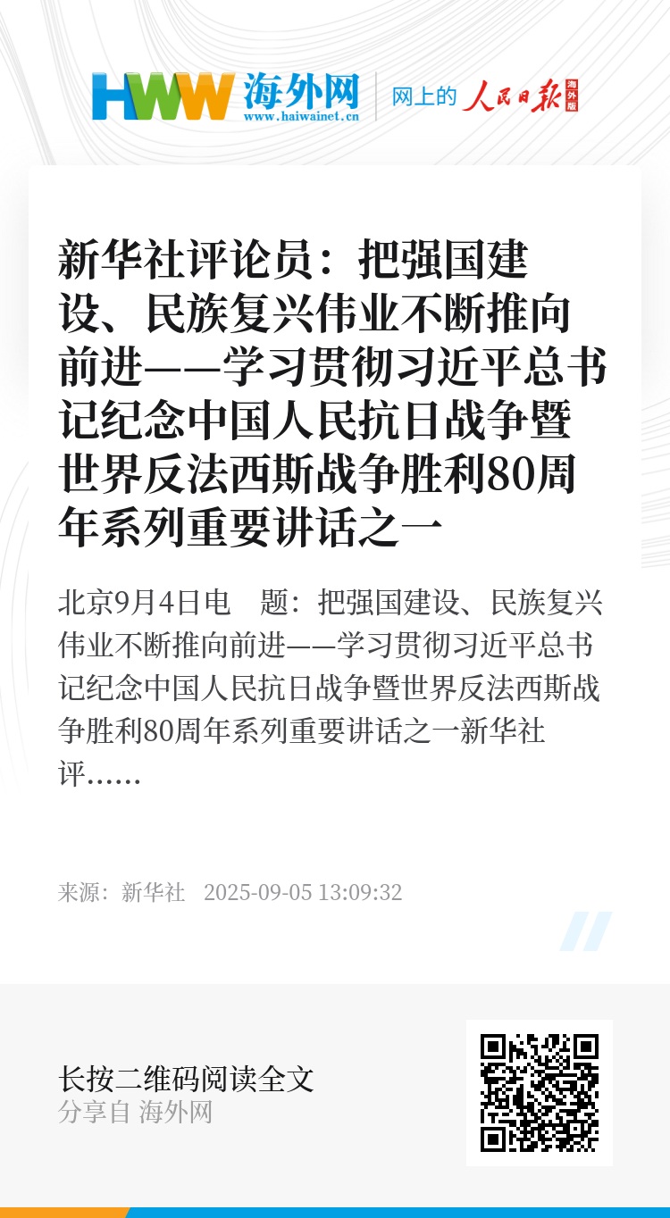 新华社北京9月4日电 题:把强国建设、民族复兴伟业不断推向前进——学习贯彻习近平总书记纪念中国人民抗日战争暨世界反法西斯战争胜利80周年系列重要讲话之一