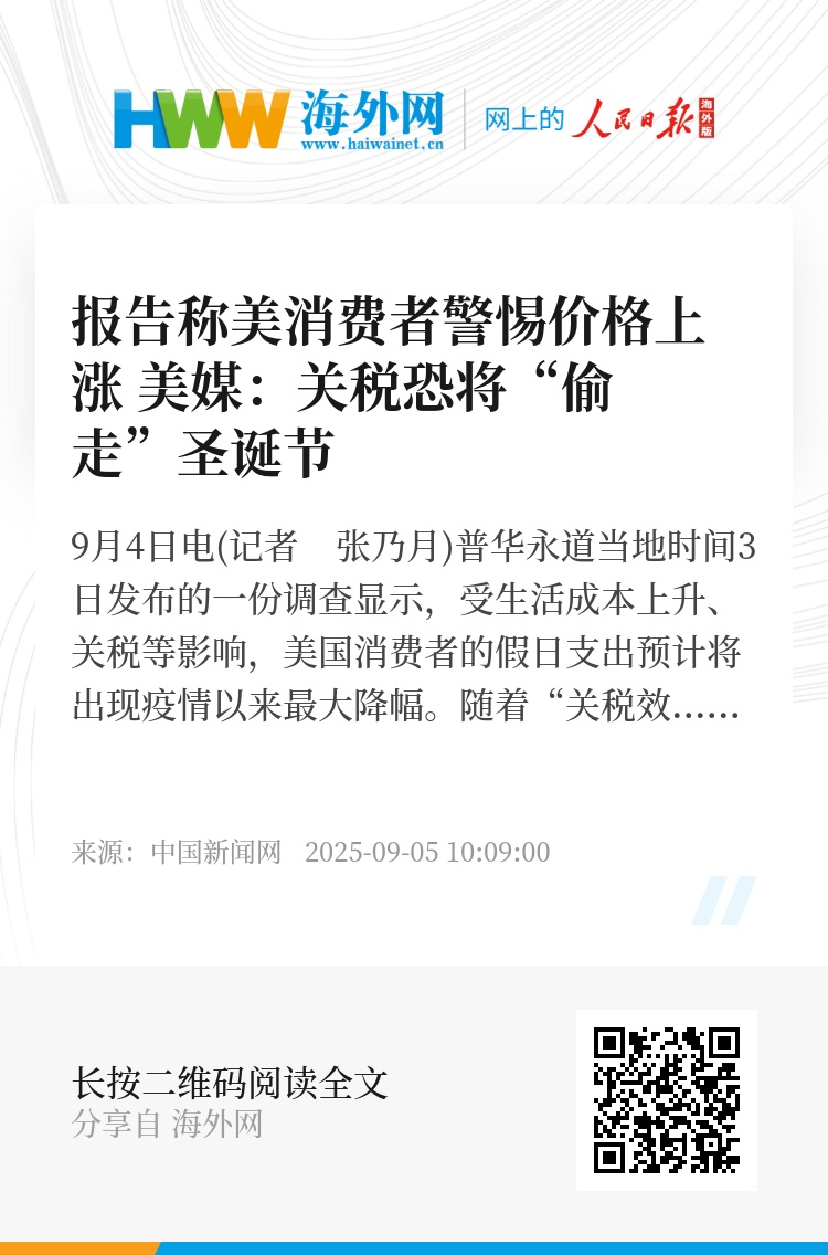 中新网9月4日电(记者 张乃月)普华永道当地时间3日发布的一份调查显示,受生活成本上升、关税等影响,美国消费者的假日支出预计将出现疫情以来最大降幅。随着“关税效应”不断显现,美媒形容,圣诞节将被关税“偷走”。