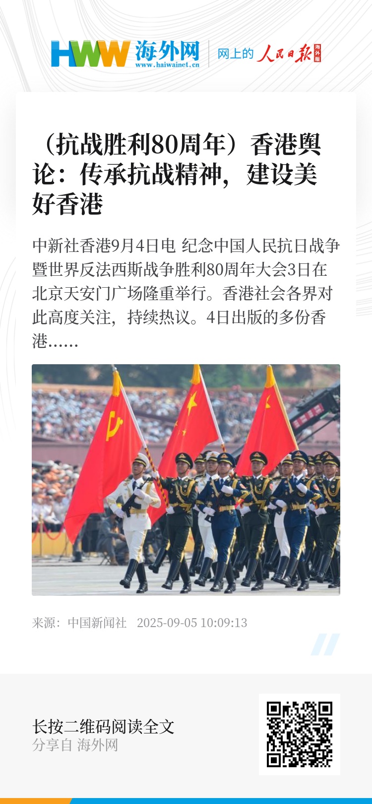 此外,在现场观礼的多位香港人士4日亦发表文章强调,香港各界需传承抗战精神,在新时代新征程作出更大贡献。