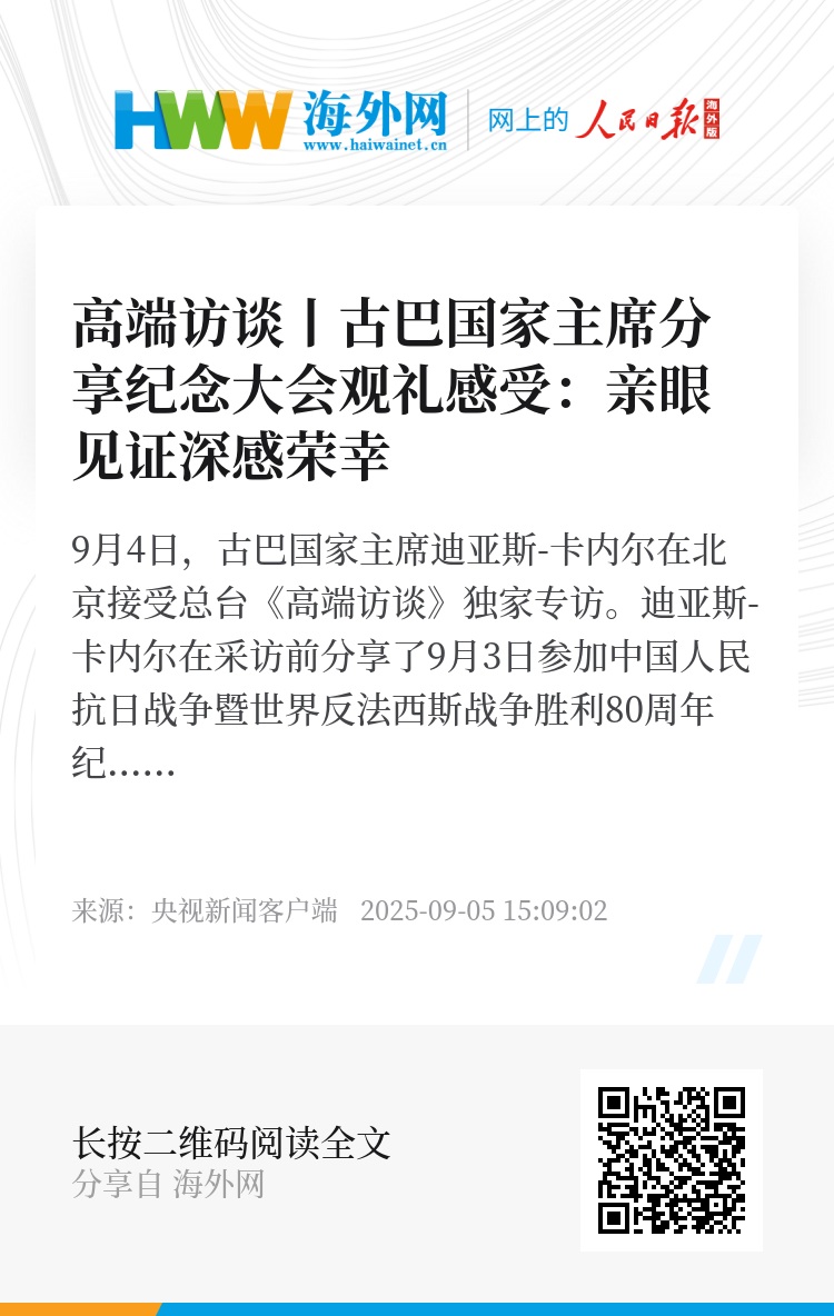 迪亚斯-卡内尔在采访前分享了9月3日参加中国人民抗日战争暨世界反法西斯战争胜利80周年纪念活动的感受。他表示,现场习近平主席的讲话令他印象深刻,讲话中强调了人类命运共同体理念,强调了多边主义和团结协作的重要性。迪亚斯-卡内尔同时称赞中国军事能力取得长足发展、蕴藏巨大潜力,并表示能够在现场亲眼见证深感荣幸。