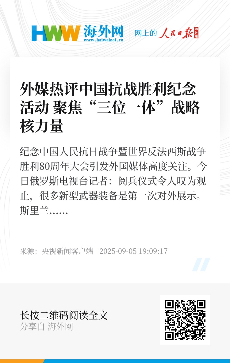 多家外媒指出,本次活动不仅展示了中国军事装备现代化取得的显著成就,还传递出这样一种信息,那就是“中国不会再受欺侮”。