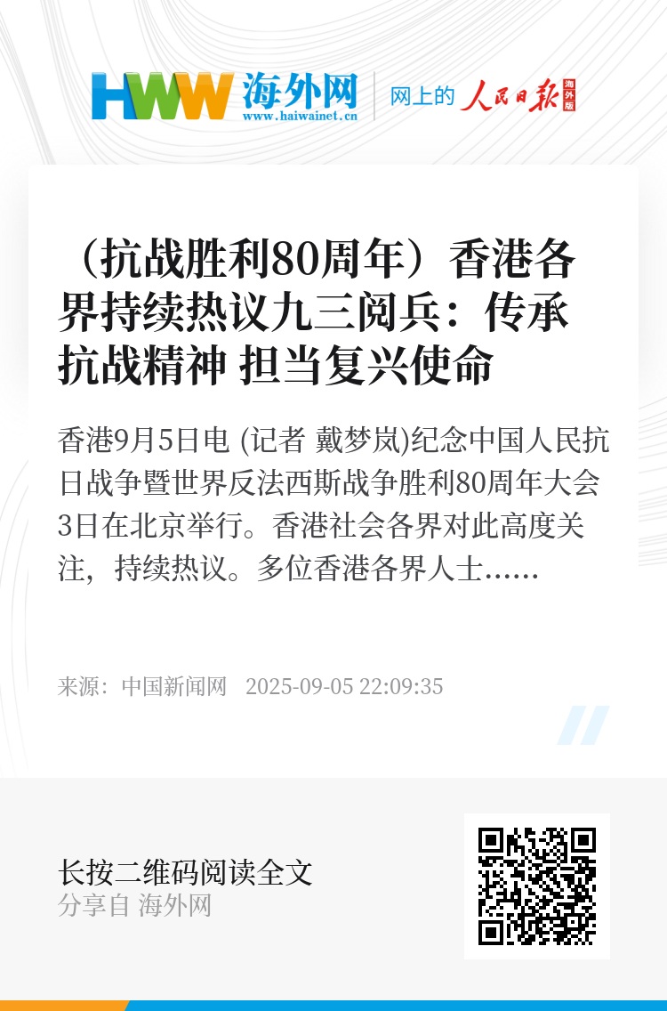 中新网香港9月5日电 (记者 戴梦岚)纪念中国人民抗日战争暨世界反法西斯战争胜利80周年大会3日在北京举行。香港社会各界对此高度关注,持续热议。多位香港各界人士4日对记者表示,从九三阅兵感受到民族复兴的磅礴力量与和平发展的坚定信念。他们强调,香港与国家命运与共,将传承伟大抗战精神,在中华民族伟大复兴进程中作出更大贡献。