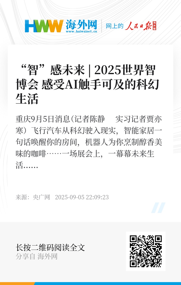 央广网重庆9月5日消息(记者陈静 实习记者贾亦寒)飞行汽车从科幻驶入现实,智能家居一句话唤醒你的房间,机器人为你烹制醇香美味的咖啡……一场展会上,一幕幕未来生活的画面在眼前徐徐展开。9月5日,2025世界智能产业博览会在重庆启幕,通过开展生态大会、专业展览、专业赛事、成果发布、产业交流对接等系列活动,全方位展现人工智能赋能生产生活发展的新特征新热点。