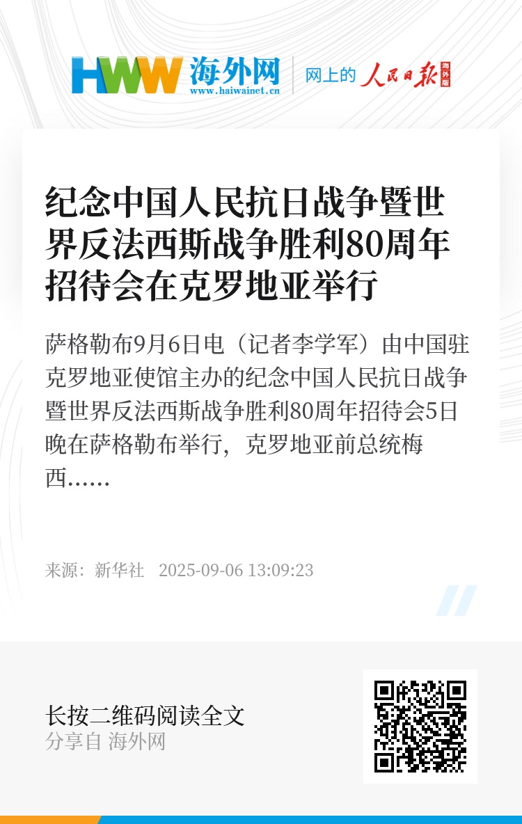 新华社萨格勒布9月6日电(记者李学军)由中国驻克罗地亚使馆主办的纪念中国人民抗日战争暨世界反法西斯战争胜利80周年招待会5日晚在萨格勒布举行,克罗地亚前总统梅西奇等80余人出席。