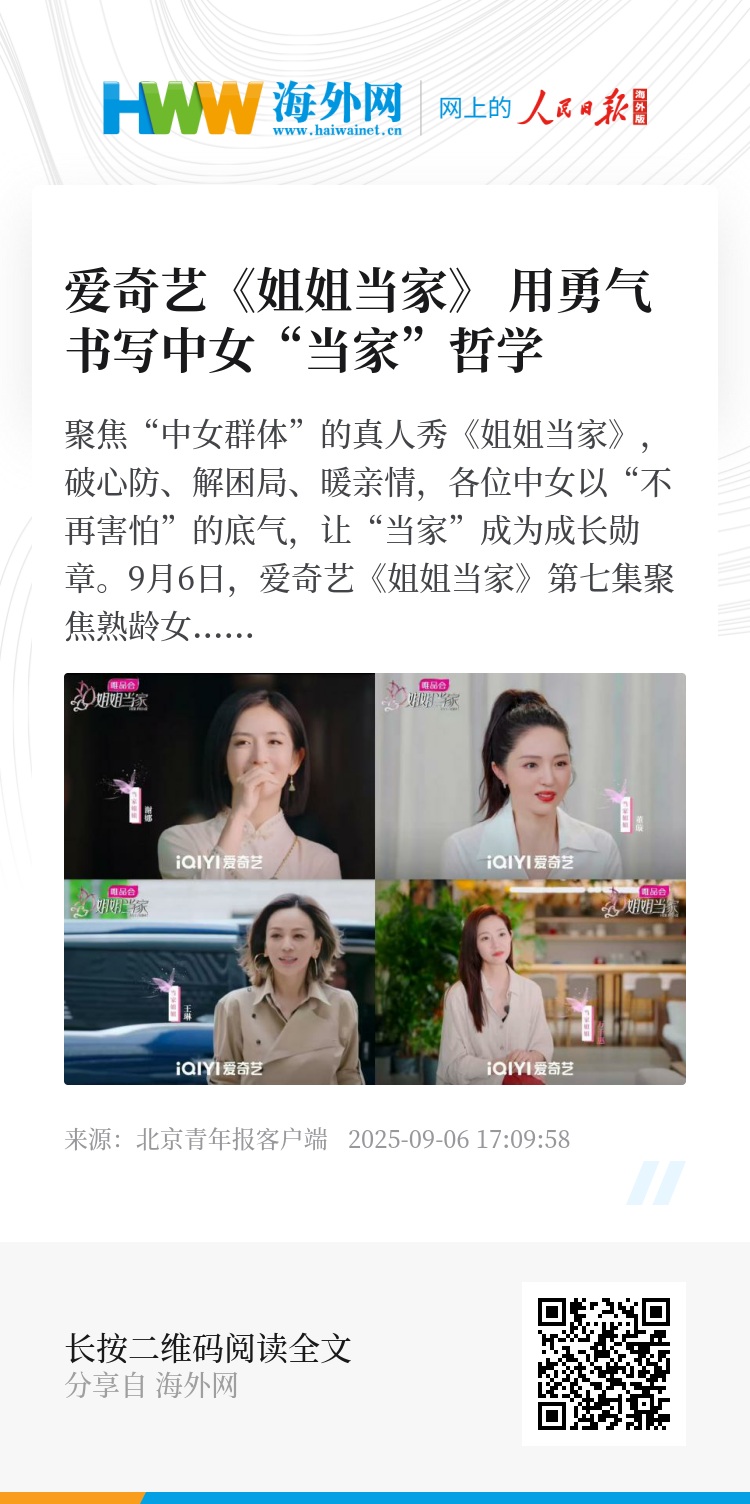 每周六中午12点,爱奇艺《姐姐当家》,江苏卫视晚间同步上星播出,跟随姐姐们的脚步,见证中女群体在当家路上把“不再害怕”活成日常。
