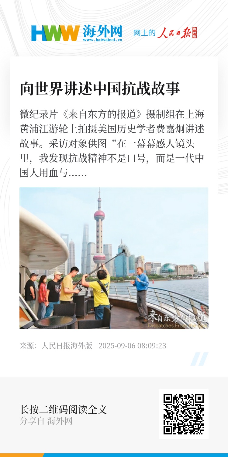 “在一幕幕感人镜头里,我发现抗战精神不是口号,而是一代中国人用血与泪为‘人类命运共同体’写下的注脚”……为纪念中国人民抗日战争暨世界反法西斯战争胜利80周年,由上海市人民政府新闻办公室、上海广播电视台真实传媒联合出品的5集微纪录片《来自东方的报道》近日在海内外社交媒体上线,网友纷纷留言点赞。