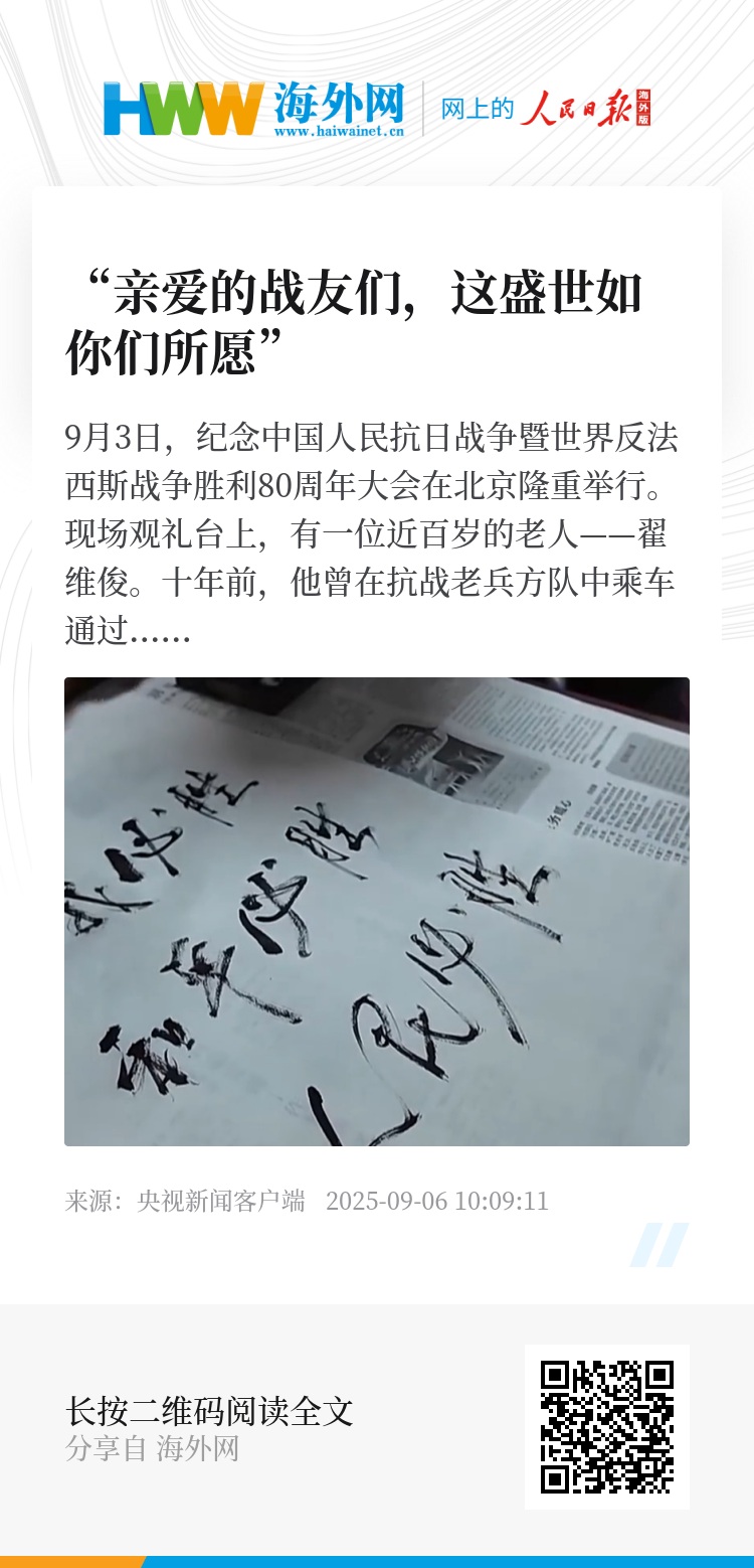 十年前,当坐在抗战老兵方队中乘车经过天安门接受检阅时,翟维俊心中有了答案:一代代中华儿女早已从先辈手中接过了枪,接续护佑盛世中华。十年后再次去往天安门前,他挥毫写下:正义必胜,和平必胜,人民必胜,这也是这位老兵心中永不磨灭的信仰。