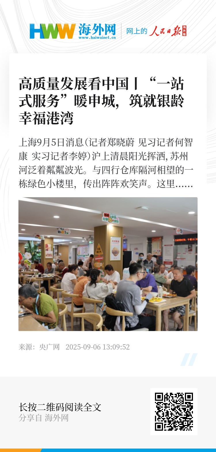 如同苏州河缓缓流淌,滋润着市民生活,上海市近年来持续推进养老服务设施建设。截至去年年底,全市已建成“一站式”“枢纽型”社区综合为老服务中心502家,用实际行动回应着“老有所养、老有所乐”的时代课题。
