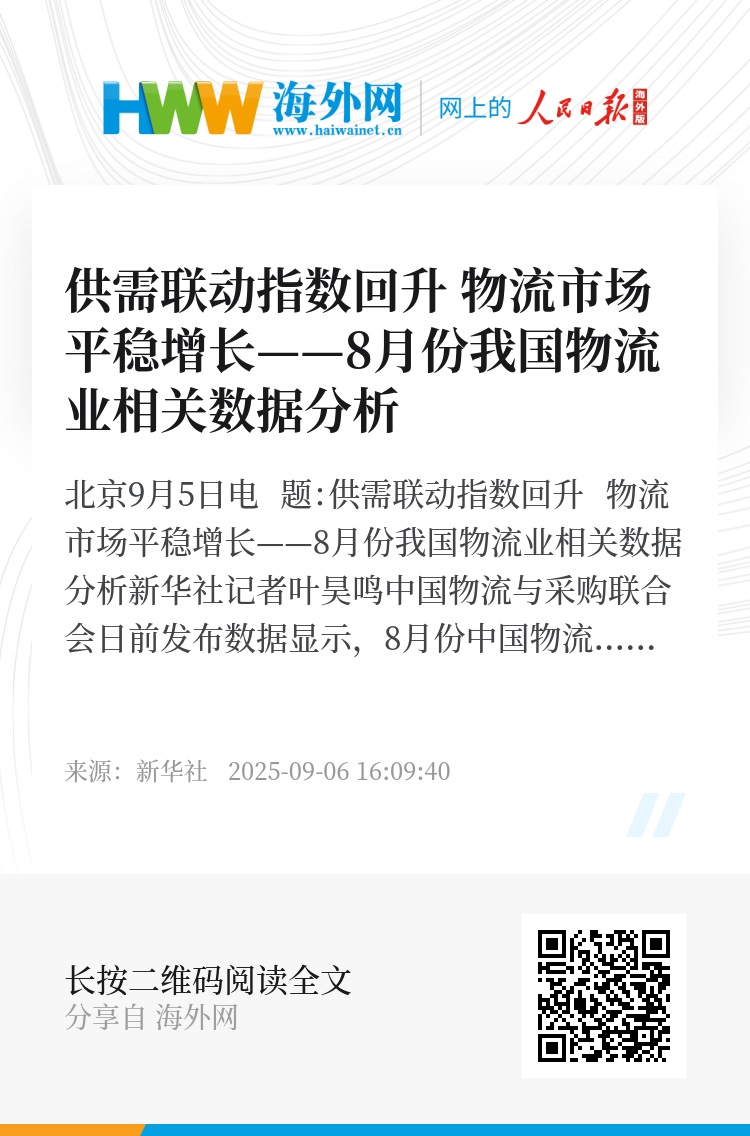 新华社北京9月5日电 题:供需联动指数回升 物流市场平稳增长——8月份我国物流业相关数据分析