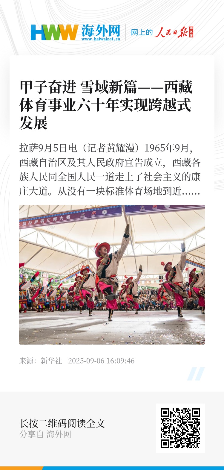 新华社拉萨9月5日电(记者黄耀漫)1965年9月,西藏自治区及其人民政府宣告成立,西藏各族人民同全国人民一道走上了社会主义的康庄大道。从没有一块标准体育场地到近万个场馆遍布高原,从无缘国际赛场到世界冠军涌现……倏忽一甲子,西藏体育事业取得了历史性的成就。体育运动作为增强人民体质、促进人的全面发展的重要途径,为高原群众注入健康活力,而西藏体育事业的巨大进步,成为西藏经济社会跨越发展的生动缩影。