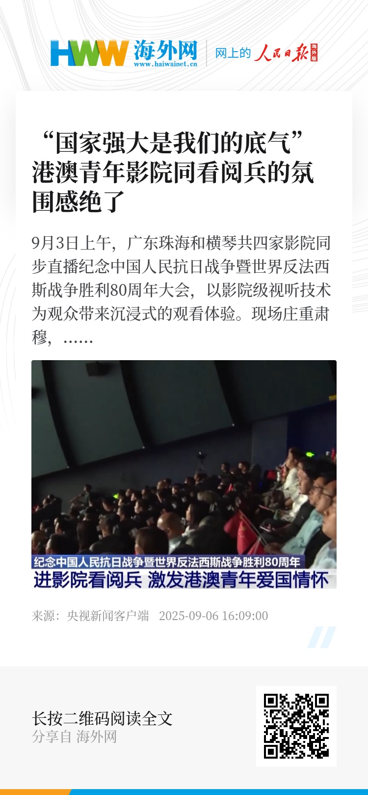 近百名港澳青年共同观看。他们纷纷表示,深受震撼与鼓舞,不仅感受到国家实力的日益强大,也更坚定了融入大湾区建设、贡献家国的信念与决心。