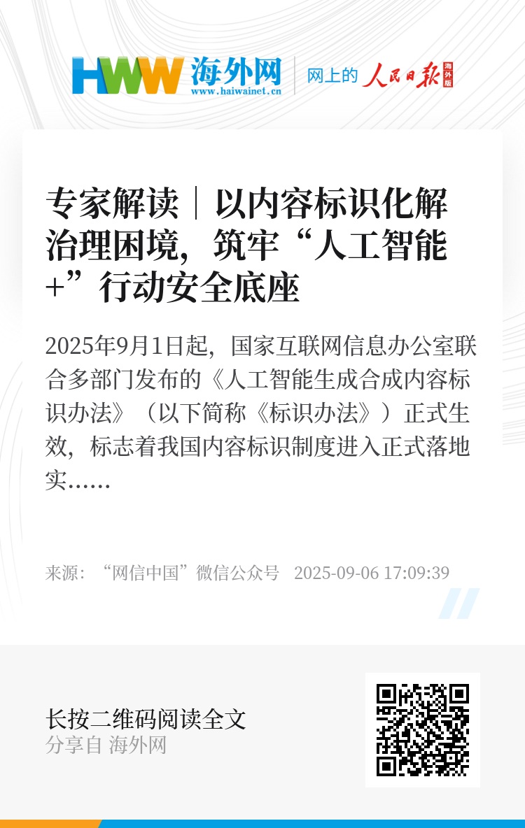 2025年9月1日起,国家互联网信息办公室联合多部门发布的《人工智能生成合成内容标识办法》(以下简称《标识办法》)正式生效,标志着我国内容标识制度进入正式落地实施阶段。在我国深入实施“人工智能+”行动背景下,探索推进内容标识制度实践,对于提升我国人工智能安全能力水平,加快形成动态敏捷、多元协同的人工智能治理格局,保障人工智能健康发展具有重要意义。