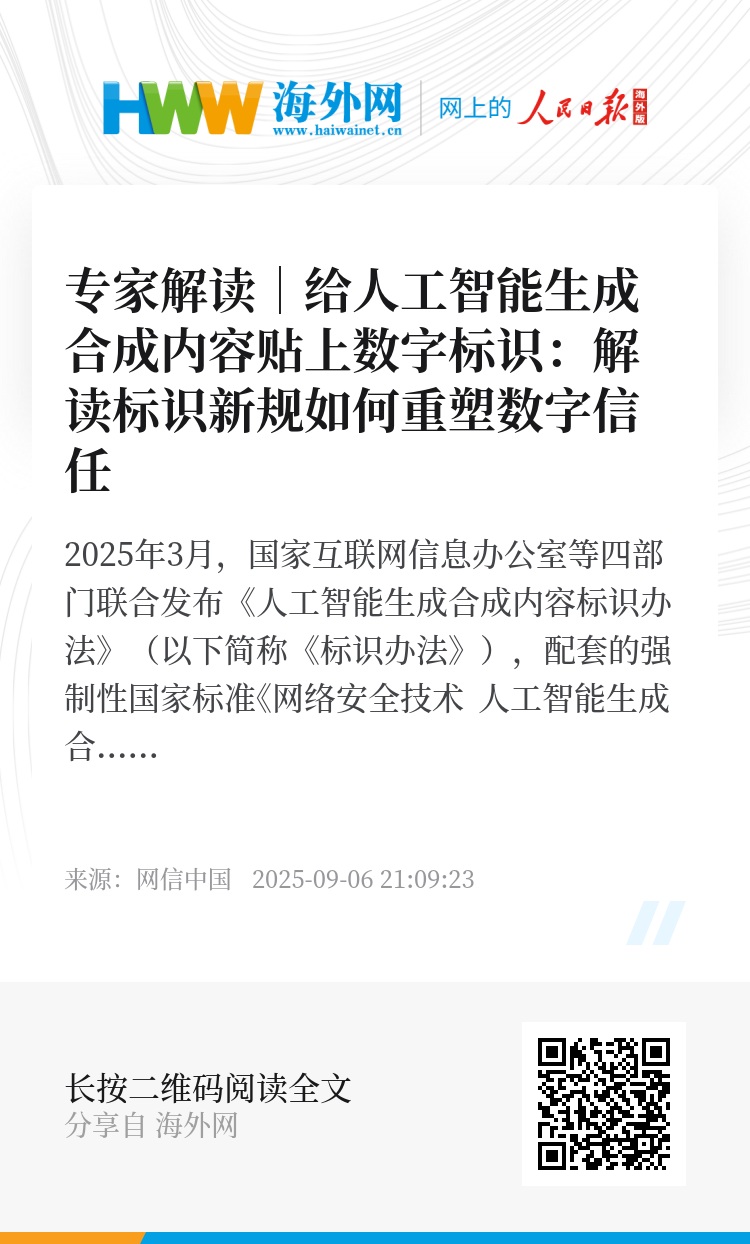 这一制度设计超越了单纯的技术合规要求,正在塑造一种全新的数字社会契约。它意味着享受人工智能创作便利的同时,必须承担相应的责任义务。人工智能生成合成内容带上了数字标识,也给鉴别内容的“真”与“假”提供了便利途径。这不仅是规范人工智能产业发展的必要之举,更是构建可信数字生态的社会基石,标志着我们正在从被动适应技术发展,转向主动塑造技术规范化发展的道路。这些举措对于推动人工智能创新发展,促进人工智能便利应用,具有积极意义。