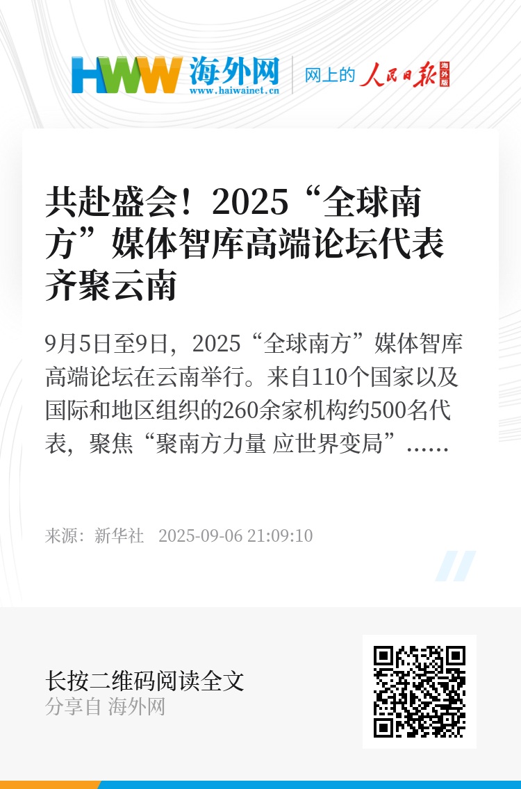 9月5日至9日,2025“全球南方”媒体智库高端论坛在云南举行。来自110个国家以及国际和地区组织的260余家机构约500名代表,聚焦“聚南方力量 应世界变局”主题开展广泛交流。