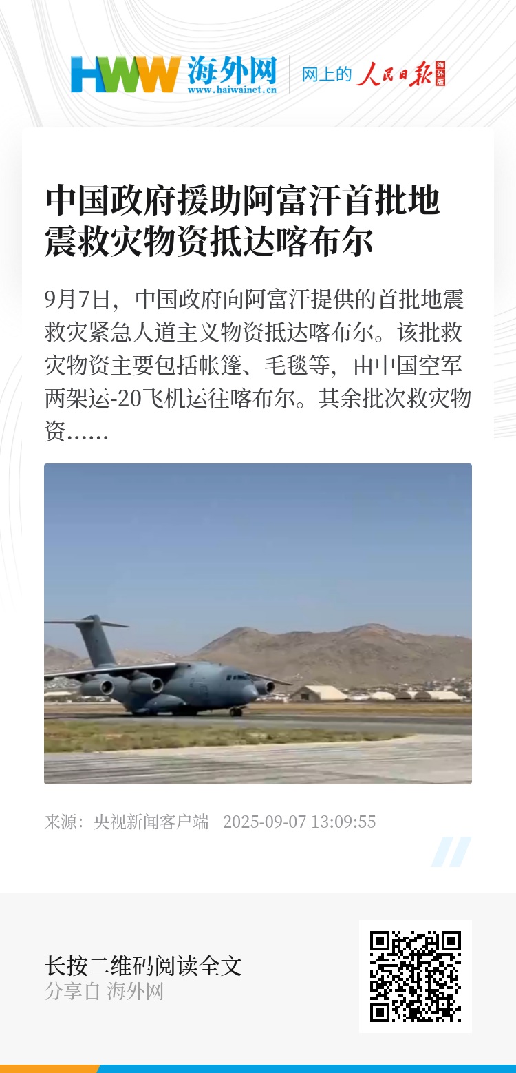 该批救灾物资主要包括帐篷、毛毯等,由中国空军两架运-20飞机运往喀布尔。其余批次救灾物资将于近日陆续空运至喀布尔并尽快发放给灾民使用。(总台记者 李霜溪)