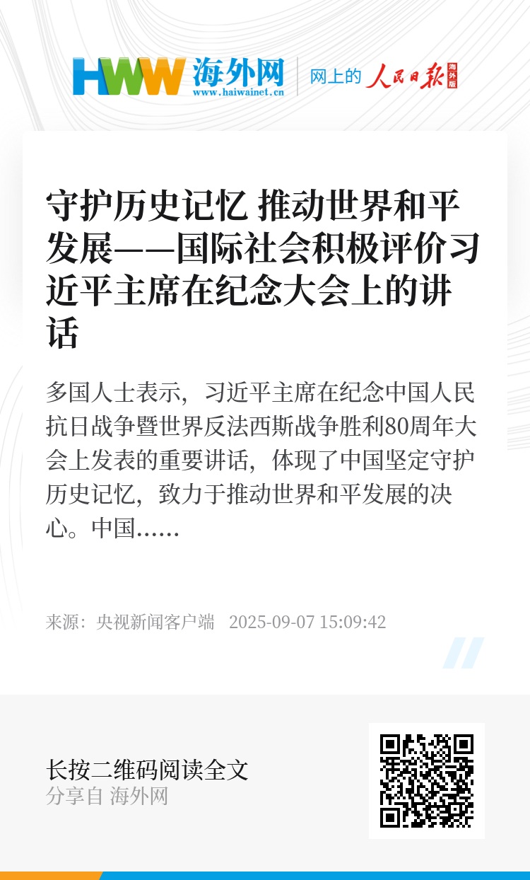 多国人士表示,习近平主席在纪念中国人民抗日战争暨世界反法西斯战争胜利80周年大会上发表的重要讲话,体现了中国坚定守护历史记忆,致力于推动世界和平发展的决心。中国在推动多边合作、维护世界和平方面展现出负责任大国担当。