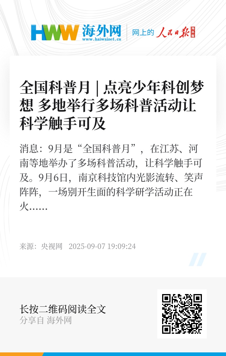 央视网消息:9月是“全国科普月”,在江苏、河南等地举办了多场科普活动,让科学触手可及。