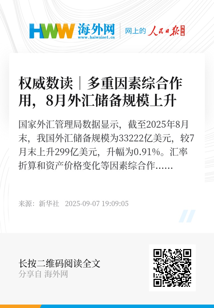 国家外汇管理局数据显示,截至2025年8月末,我国外汇储备规模为33222亿美元,较7月末上升299亿美元,升幅为0.91%。