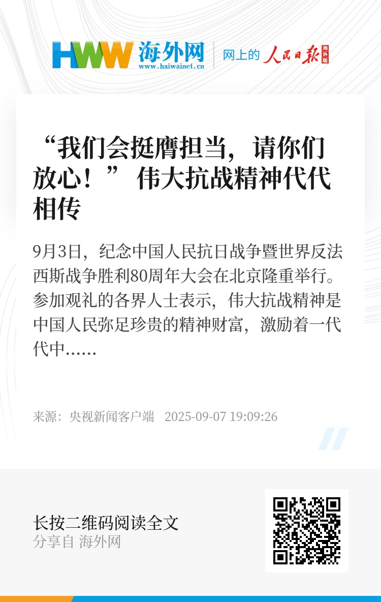 9月3日,纪念中国人民抗日战争暨世界反法西斯战争胜利80周年大会在北京隆重举行。参加观礼的各界人士表示,伟大抗战精神是中国人民弥足珍贵的精神财富,激励着一代代中国人克服艰难险阻、为实现中华民族伟大复兴而奋斗。