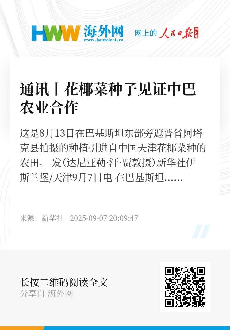 从天津到旁遮普,从实验室到田间地头,一粒粒花椰菜种子见证着中巴农业合作结出硕果。“这些种子不仅仅是庄稼,更是我们的希望。”萨夫达尔说。(新华社记者蒋超 王晖 孙凡越)
