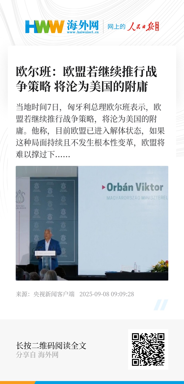 欧尔班称,只要俄乌冲突持续,欧盟在防务上就将完全受制于美国,成为一个“跛脚鸭”,而这种脆弱性也妨碍了欧盟实施独立的贸易政策。因此,继续推动战争对欧洲而言是一项失败的策略。欧尔班说,欧洲应与俄罗斯达成协议,将乌克兰排除在北约和欧盟扩张计划之外。