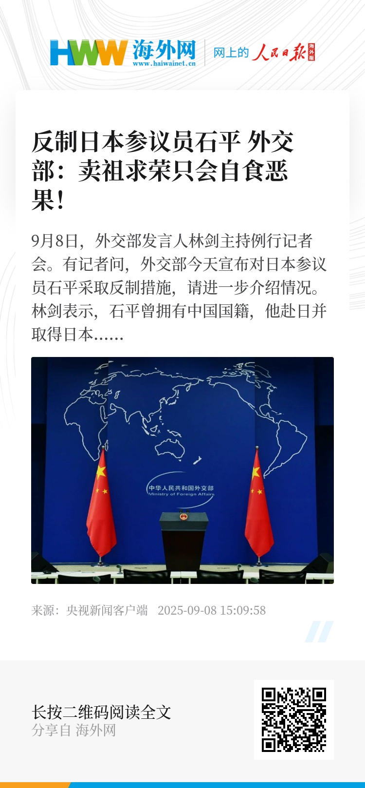 9月8日,外交部发言人林剑主持例行记者会。有记者问,外交部今天宣布对日本参议员石平采取反制措施,请进一步介绍情况。