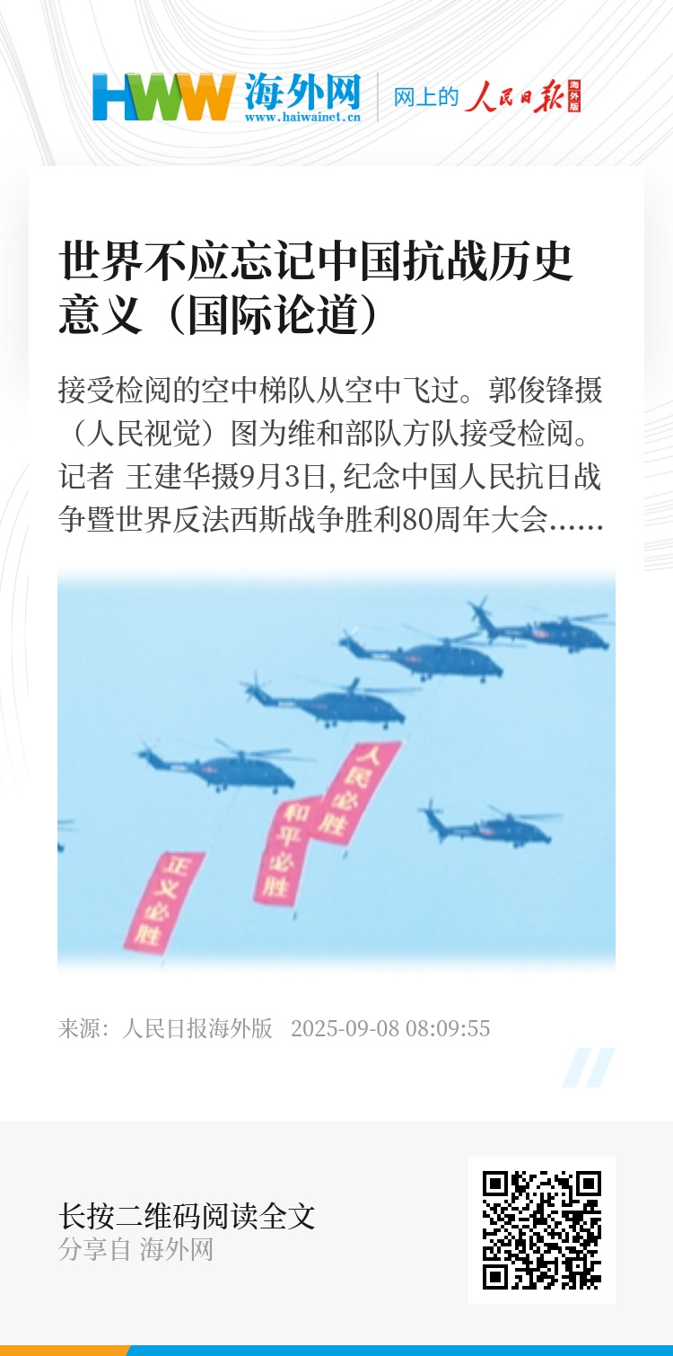 巴西247新闻网刊登题为《中国将纪念抗日战争暨世界反法西斯战争胜利80周年作为推动世界和平的力量》的文章指出,9月3日,中国传递出一个清晰、鼓舞人心和强有力的信息:一个大国可以不诉诸战争而崛起,可以不侵犯任何国家而维护主权,可以不筑高墙而架设桥梁,成为世界秩序的积极参与者。中国重申对和平与共同发展的承诺,邀请世界思考历史的真正教训。