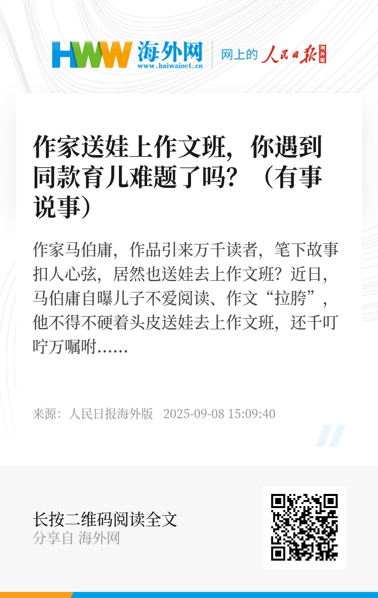 近日,马伯庸自曝儿子不爱阅读、作文“拉胯”,他不得不硬着头皮送娃去上作文班,还千叮咛万嘱咐“不许对老师说你爸是谁”。这番幽默自嘲,引发不少网友共鸣——原来,大作家也有同款育儿难题。